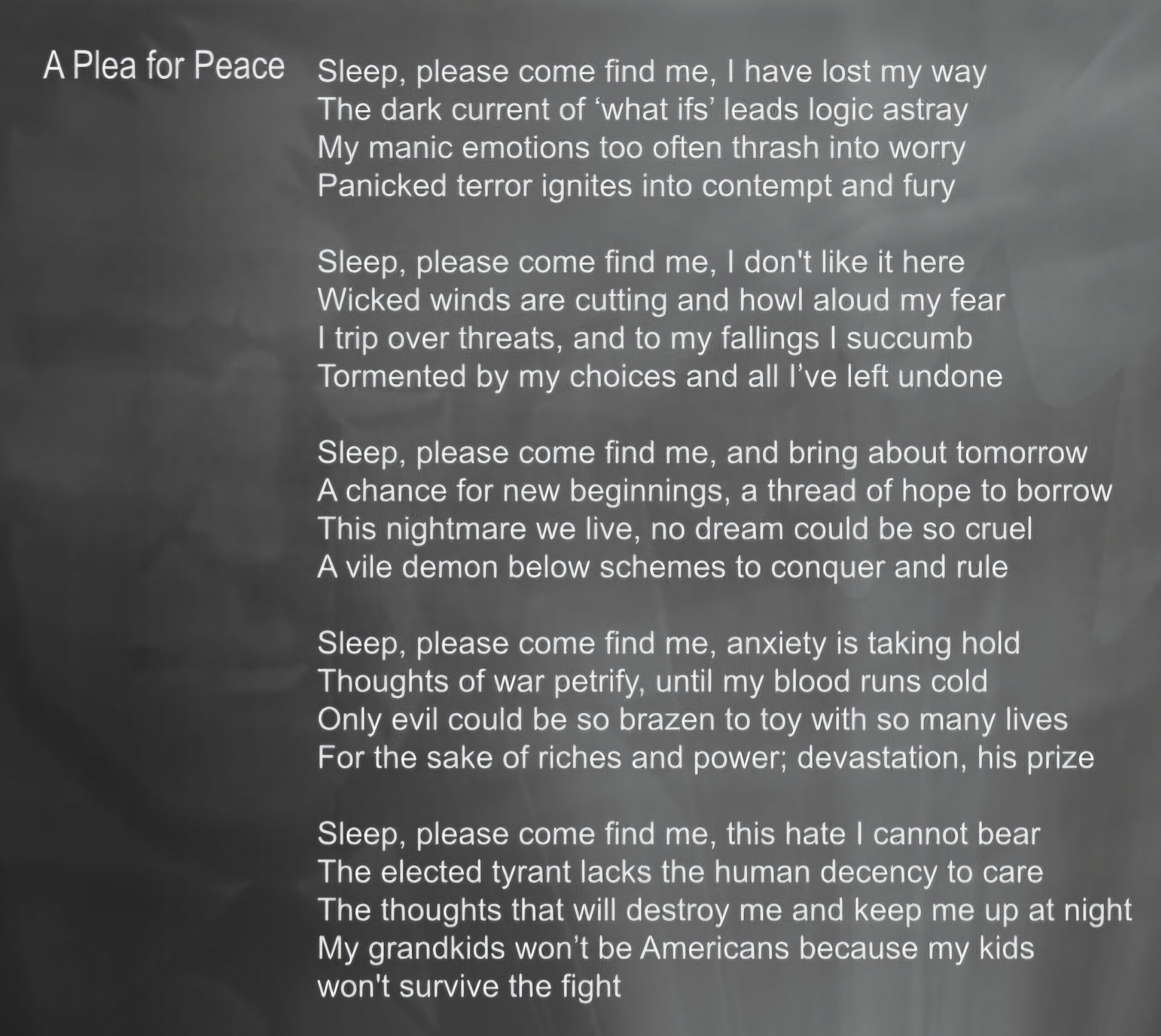 Plea for Peace March 18, 2025 2560 × 2284 Plea for Peace Sleeplessness: Trump Trauma An Emily Wright original poem. A shared secret about anxiety and fury over Trump Trauma