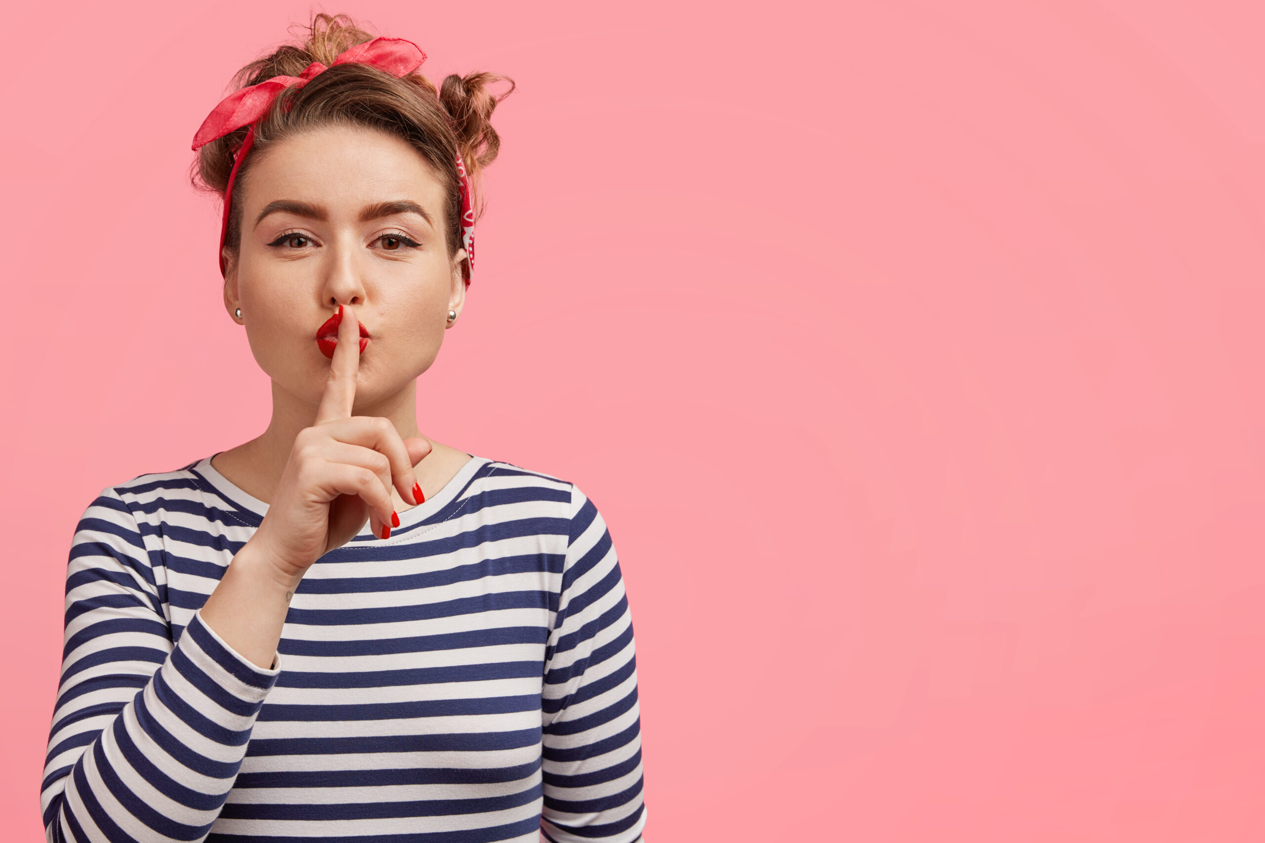 Portrait of lovely gorgeous woman with attractive look, keeps fore finger on lips, poses against pink background with blank copy space, demonstrates hush sign, isolated. Conspiracy and secrecy